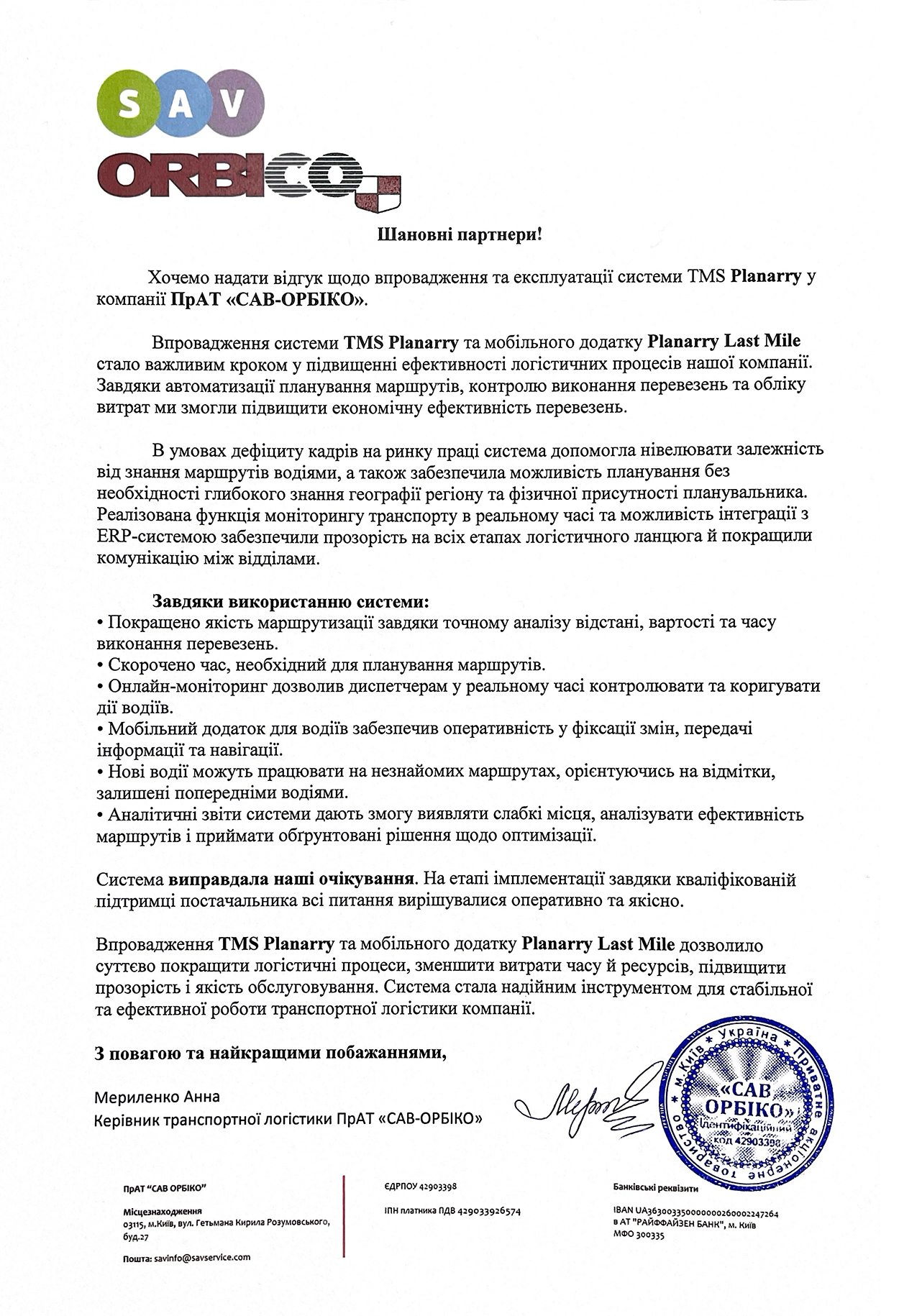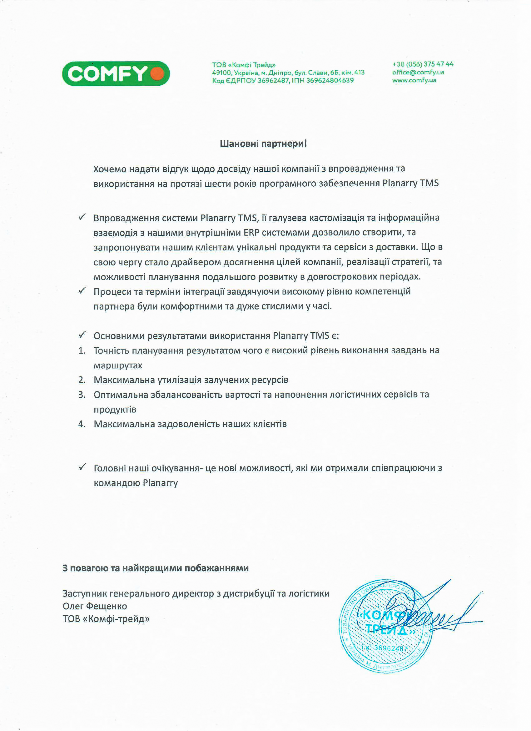 Впровадження системи Planarry TMS, її галузева кастомізація та інформаційна взаємодія з нашими внутрішніми ERP системами дозволило створити, та запропонувати нашим клієнтам унікальні продукти та сервіси з доставки. Що в свою чергу стало драйвером досягнення цілей компанії, реалізації стратегії, та можливості планування подальшого розвитку в довгострокових періодах.